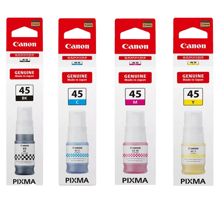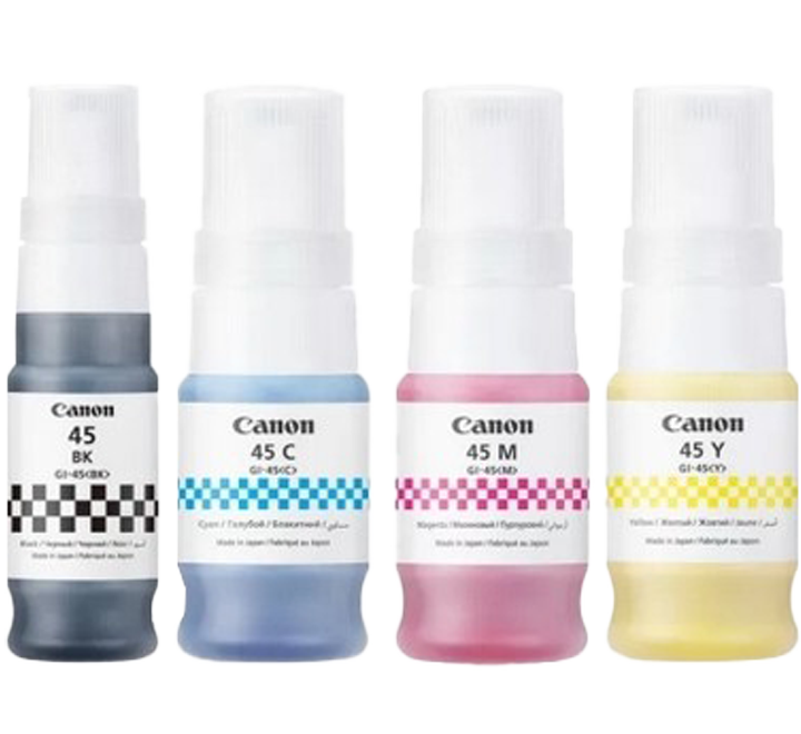 Canon GI-45BK, GI-45C, GI-45M ve GI-45Y mürekkep şişeleri ile hem yüksek kaliteli hem de ekonomik baskı deneyimi yaşayabilirsiniz. A4ofis.com güvencesiyle orijinal ürünleri güvenle temin edebilirsiniz.